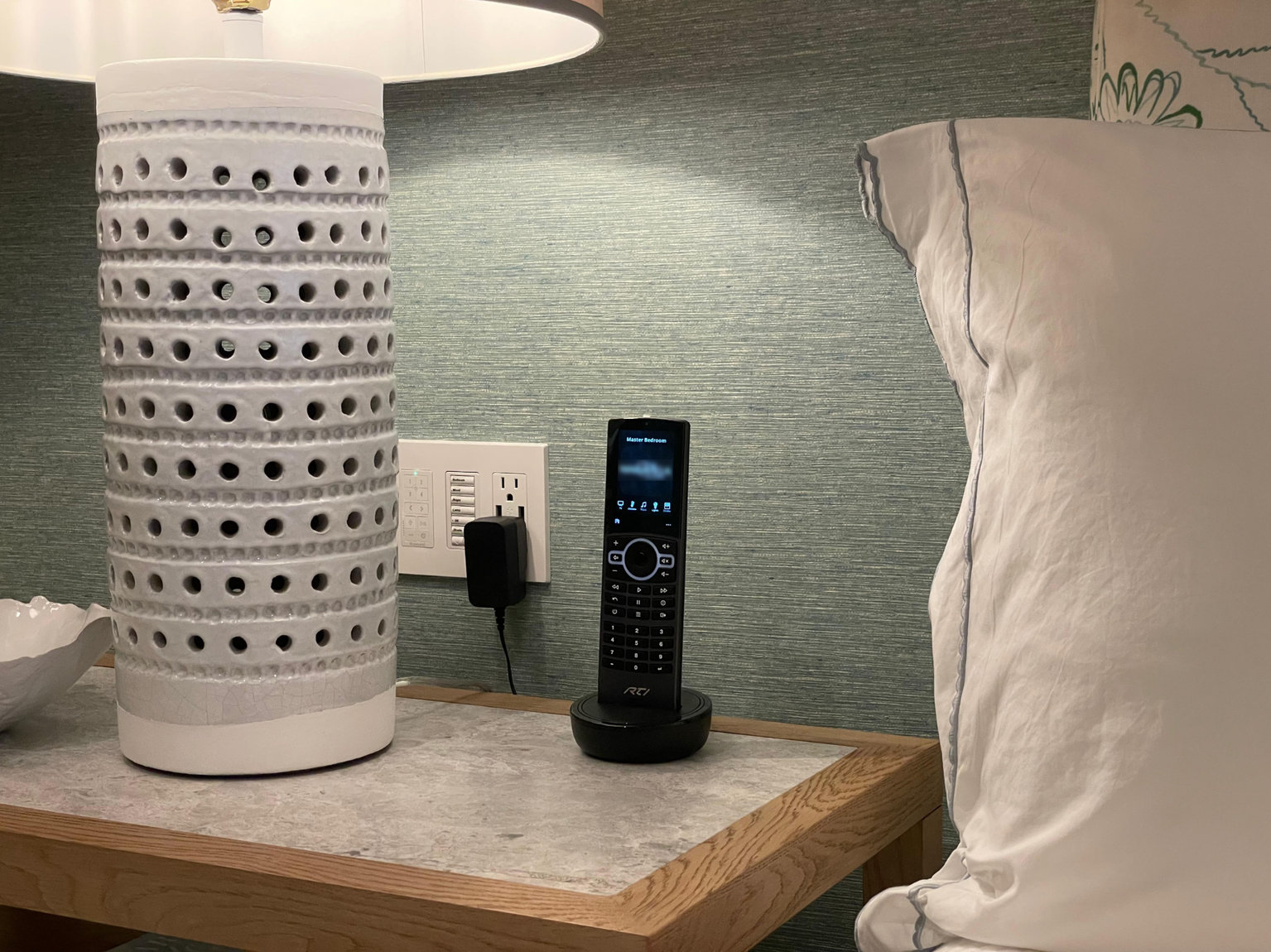 A simple yet effective setup: one RTI remote provides control of temperature and television, maintaining consistency with the rest of the home’s interface.