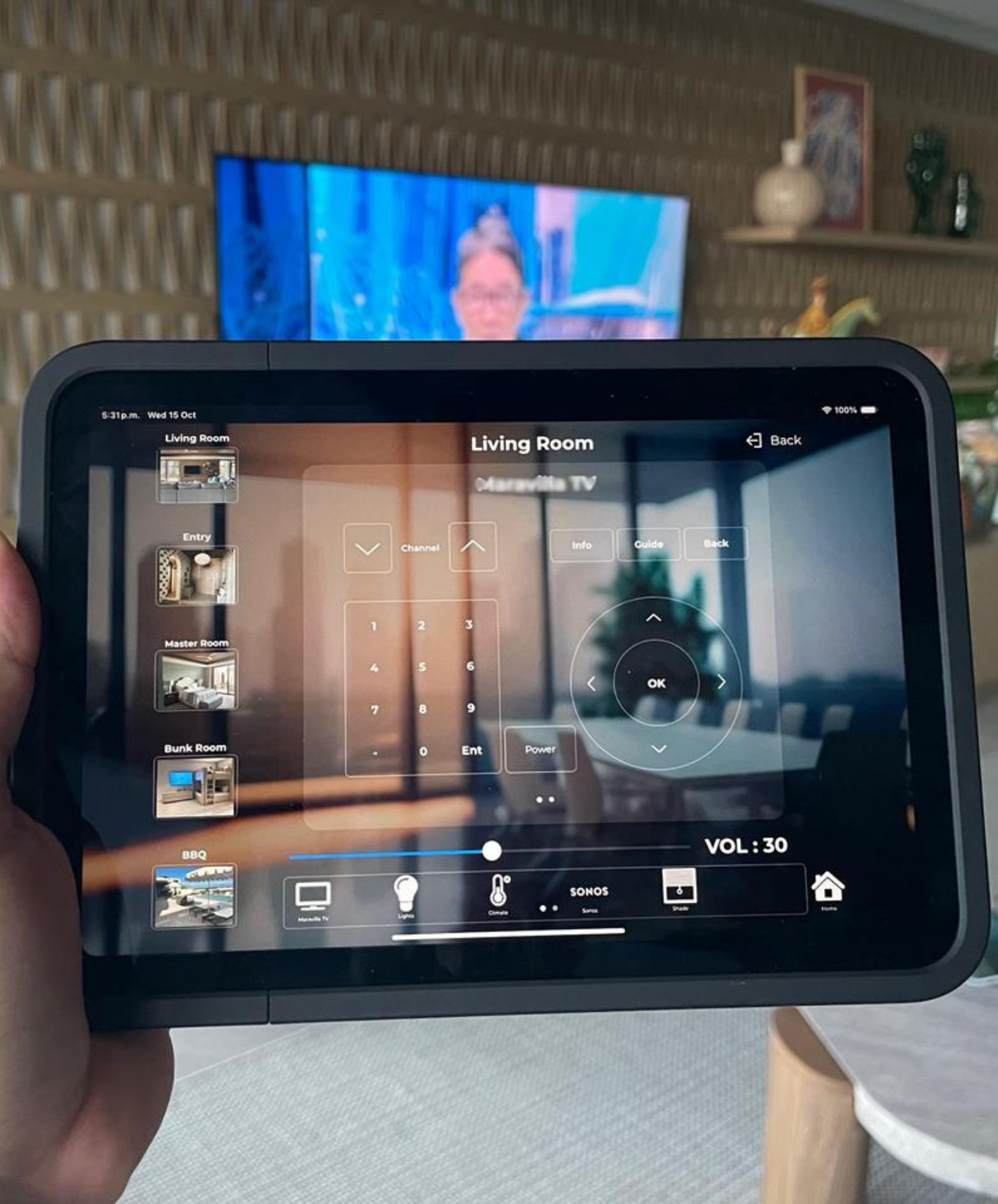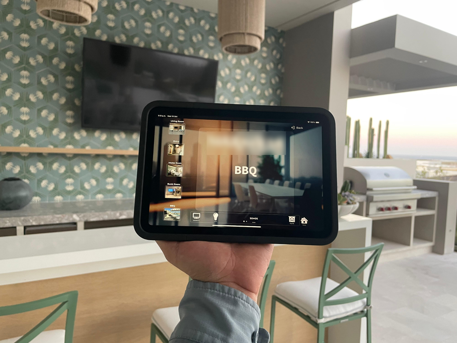 Outdoors, automation meets leisure. From a single remote, the user can control the exterior TV, adjust the audio for the perfect atmosphere, and ignite the fire pit, setting the tone for a perfect pool day.